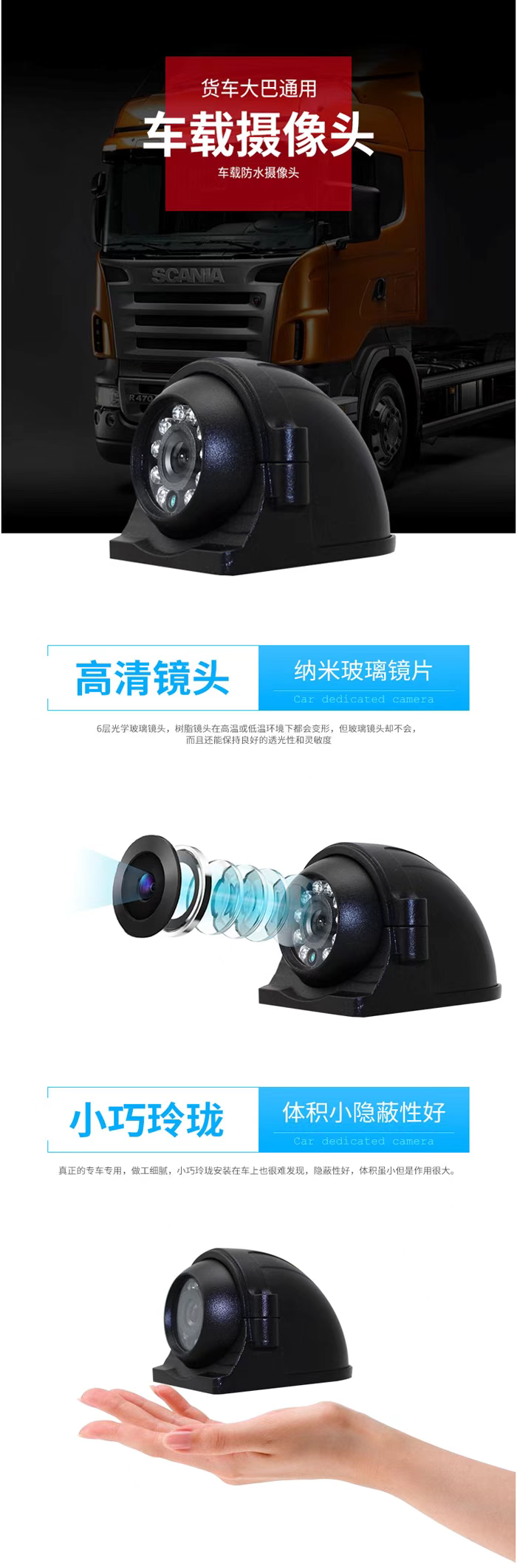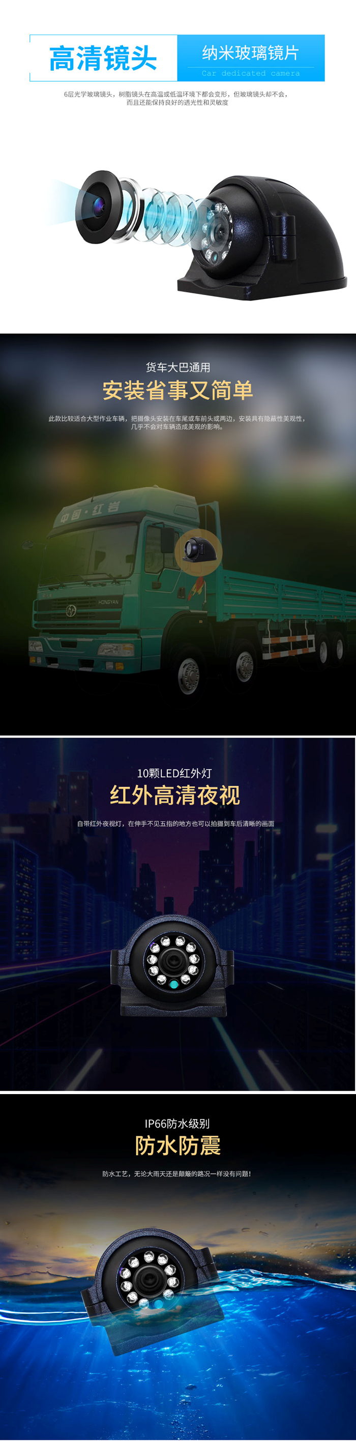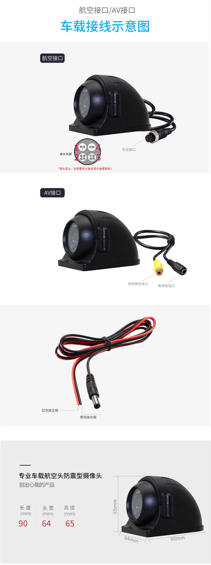 防暴側視車載紅外防水攝像頭,采用高解原裝AHD系列芯片加裝車載專用金屬Z新IR-OUT雙濾光片切換器,色彩還原度高,圖像清晰細膩,躁點細膩,細節更柔,UTC功能,防雷保護,過壓保護,防靜電處理,3D降噪,支持圖像正/鏡像調整。出廠12顆¢5臺灣鼎元紅外燈,出廠標配為3.6MM三百萬像素IR鏡頭,可選2.8mm/3.6mm鏡頭,外采用阻燃線材,直徑4.0MM國標純銅線,帶雙層帶屏蔽防震級別10G,防水等級:IP69 材質:金屬鋁合金,凈重:330G 出廠配置:攝像頭1臺,支架一個,出廠接口航空母頭,電壓DC12V