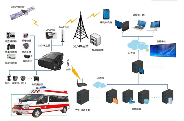 救護車實時視頻監控系統,通過前端安裝在救護車攝像機,將救護車的實時圖像通過無線4G網絡傳輸到中心的監控中心。另一方面用系統本身也將定時將GPS信息通過4G無線網絡傳輸到監控中心實時報告救護車的位置。